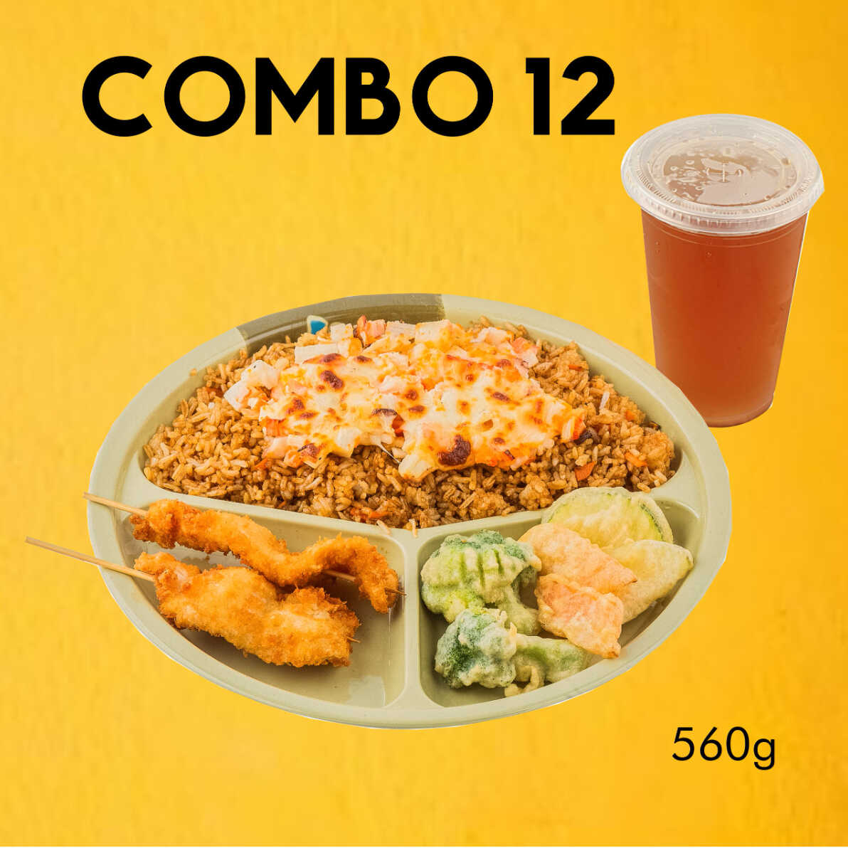 Yakimeshi de mariscos gratinado, 2 brochetas de pollo, verduras, escoge tu bebida favorita.