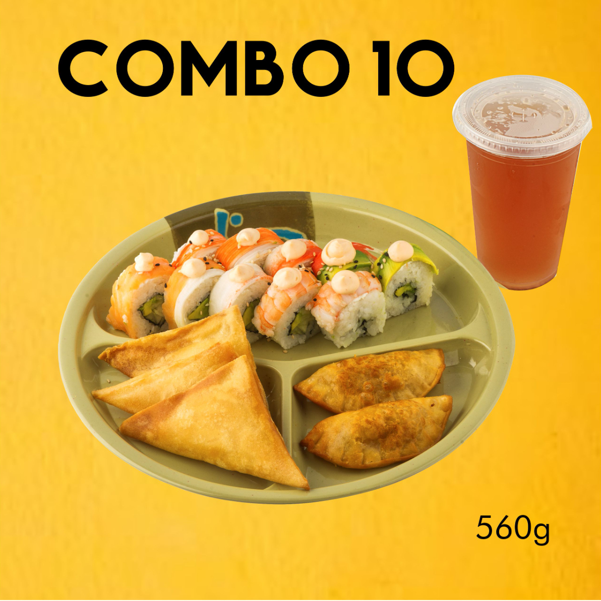 sushi arcoiris espeical, 3 dumplings, 2 giosas, escoge tu bebida favorita.