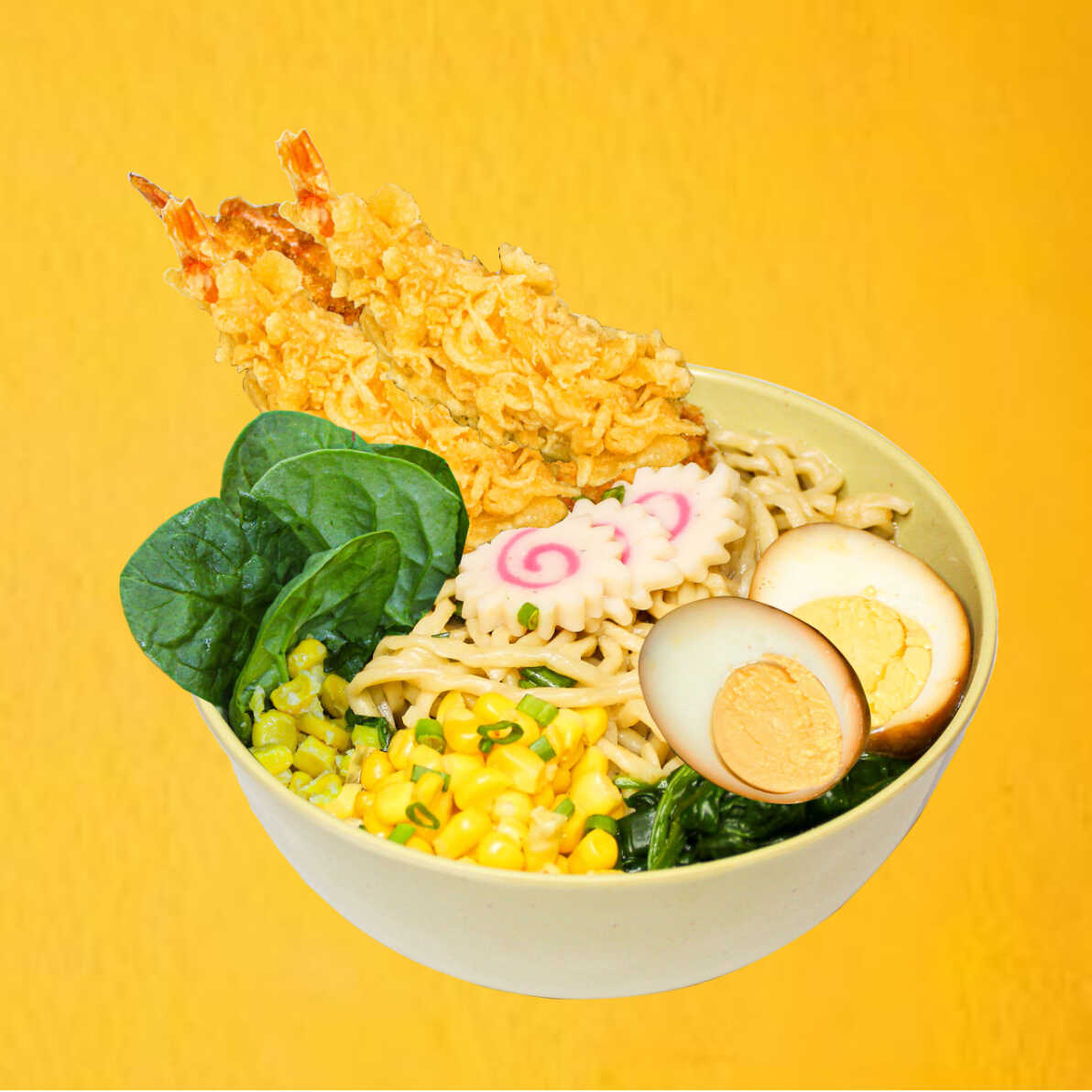 RAMEN EBI 550G con caldo miso, 2 camarones capeados, 1 huevo, elote dulce, espinaca y 2 narutos