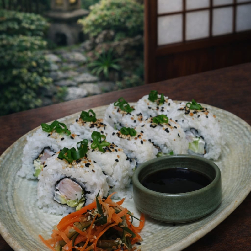Rollo Frío, por dentro Camarón, Queso Crema, Alga Nori, Pepino y Aguacate, por fuera Mix de Ajonjolí y Cebollín.