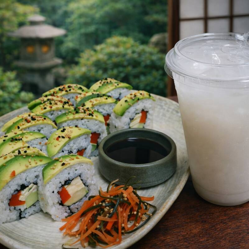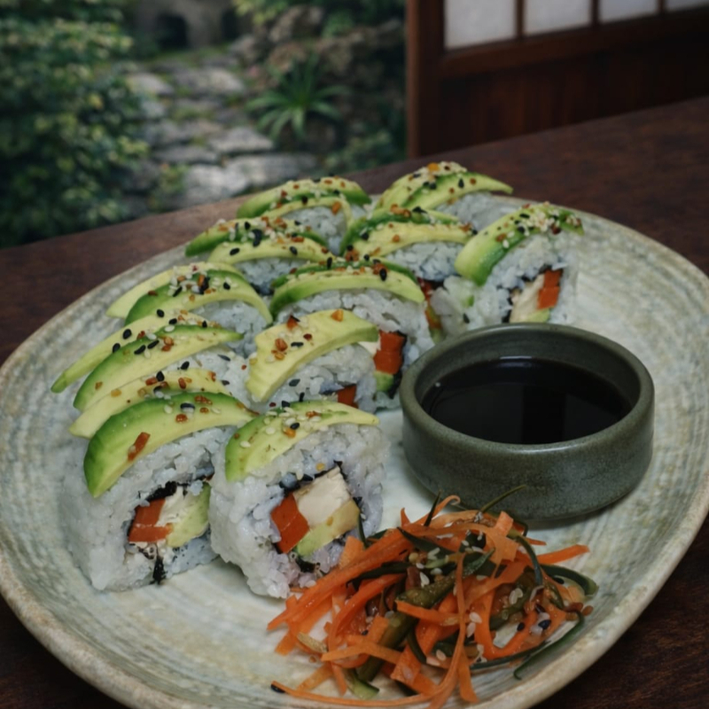 Rollo Frío, por dentro Tofu Marinado, Zanahoria, Pepino y Alga Nori, por fuera, Láminas de Aguacate y Mix de Ajonjolí.