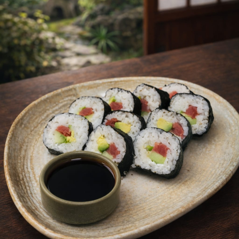 Rollo Frio, por dentro Alga Nori, Atún o Salmón, Aguacate, Pepino y Queso Crema, por fuera Alga Nori.