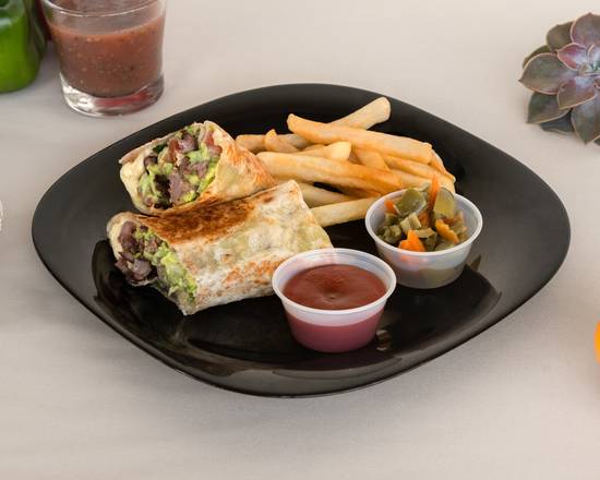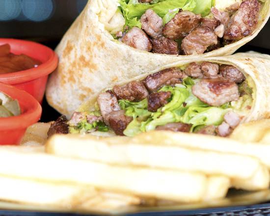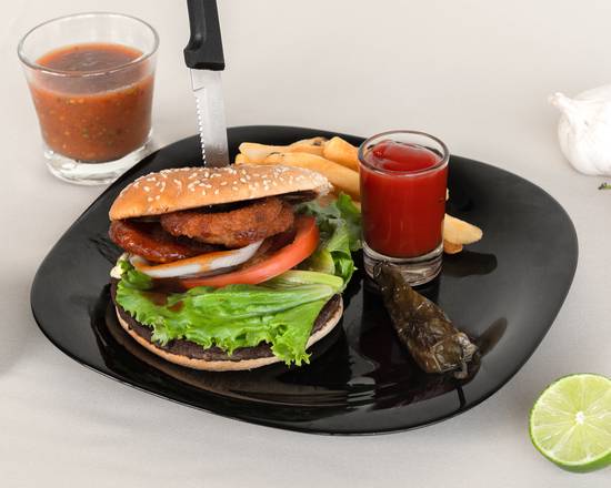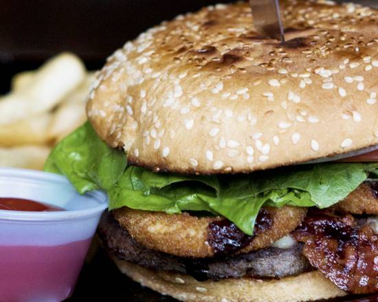 Carne natural, tocino, arros de cebolla, chiles toreados y salsa BBQ.