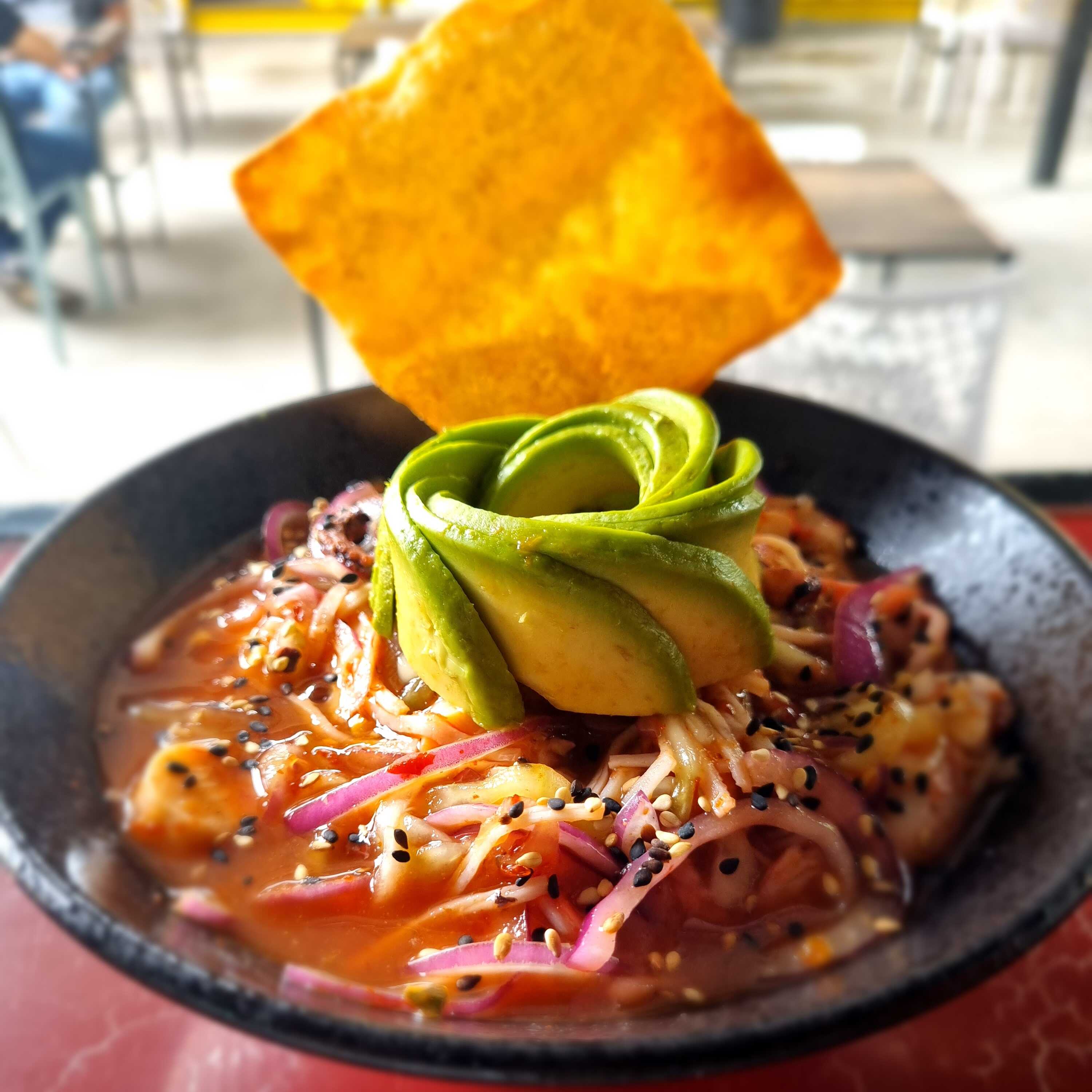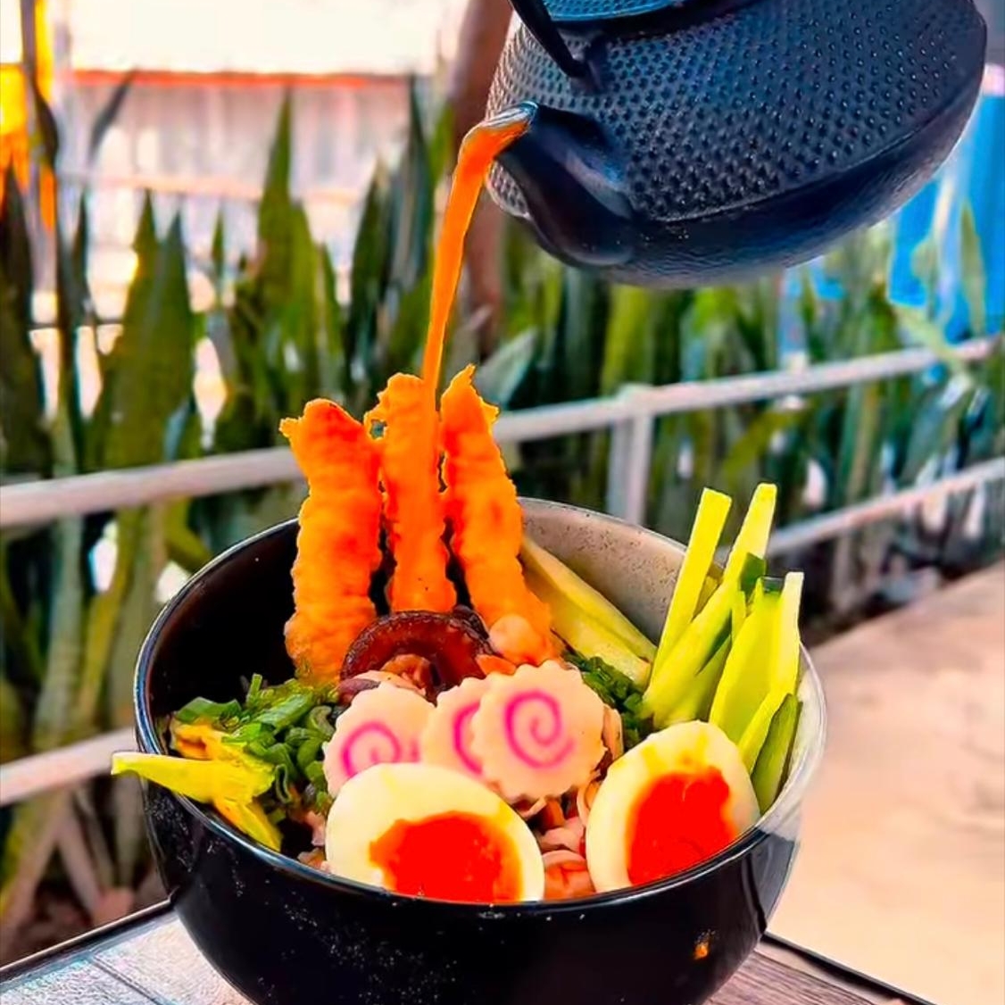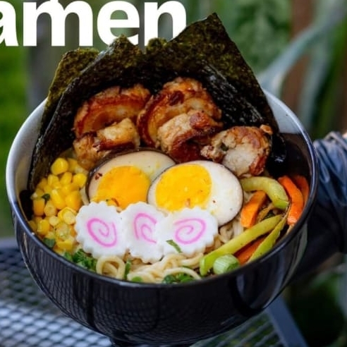 Pasta, huevo cocido, verduras, alga nori y panceta de cerdo