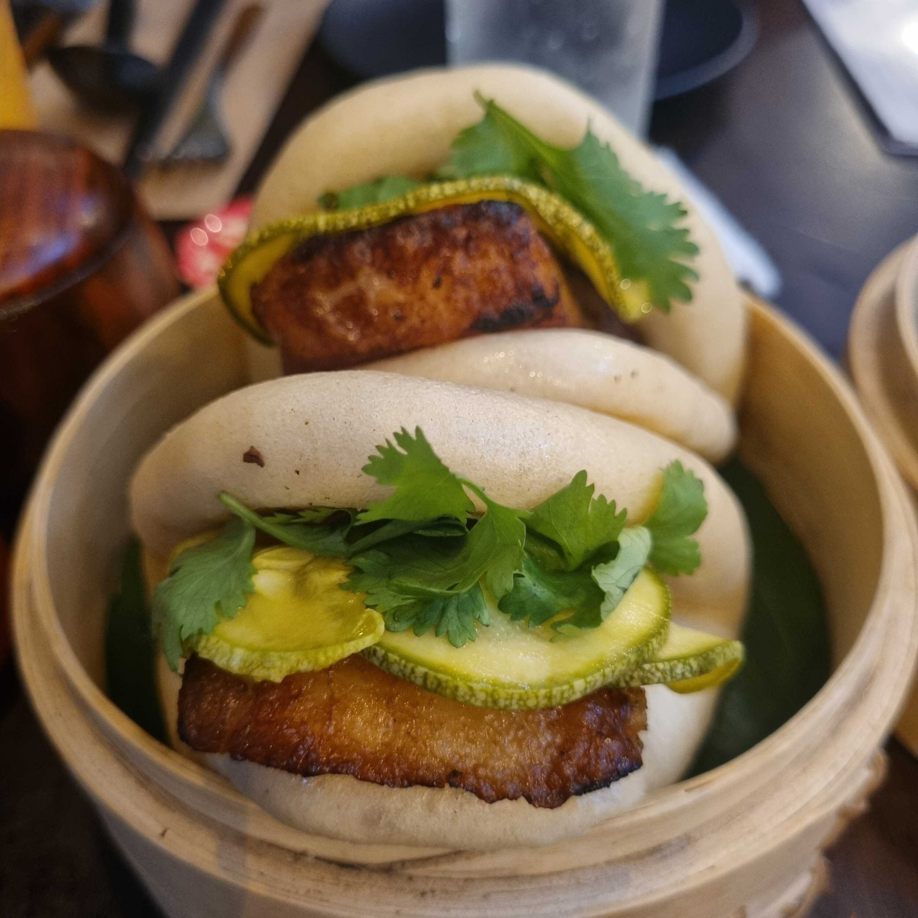 Panceta de cerdo con vegetales y salsa teriyaki en pan suave japonés