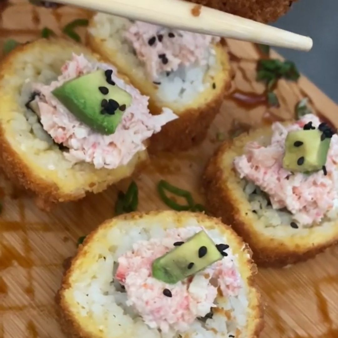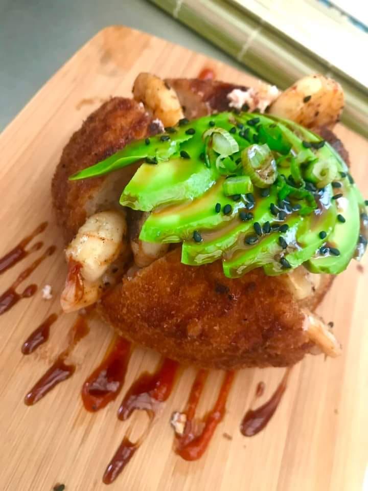 Bola de arroz empanizada, coronada con aguacate y bañada con salsa de anguila.