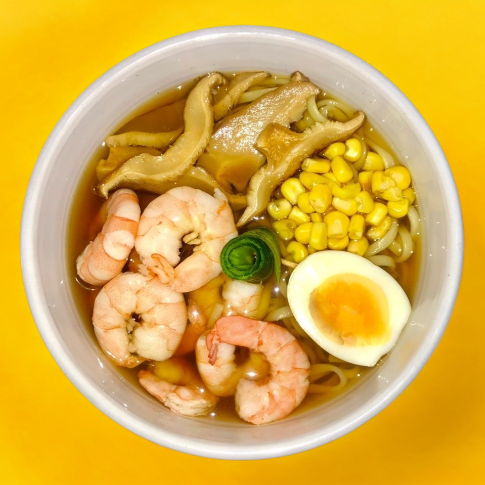 Pasta Udon, elote, huevo, shikate, camarón y res, con poderoso fondo de jengibre y mix de verduras