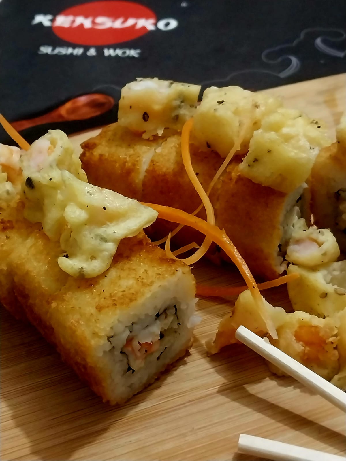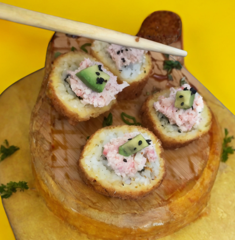 Por dentro: camarón tempura y aguacate, por fuera: queso manchego.