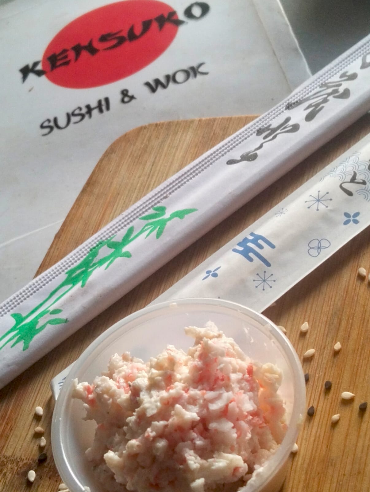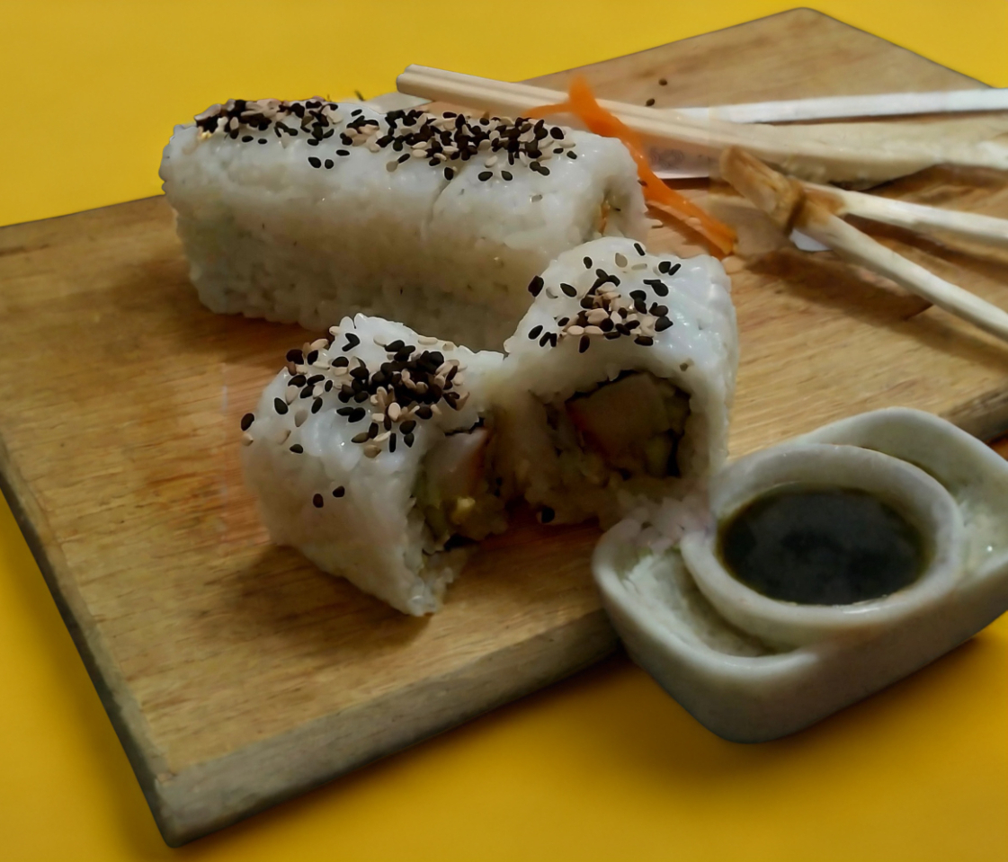 Por dentro: surimi, pepino y aguacate, por fuera: mix de ajonjolí.