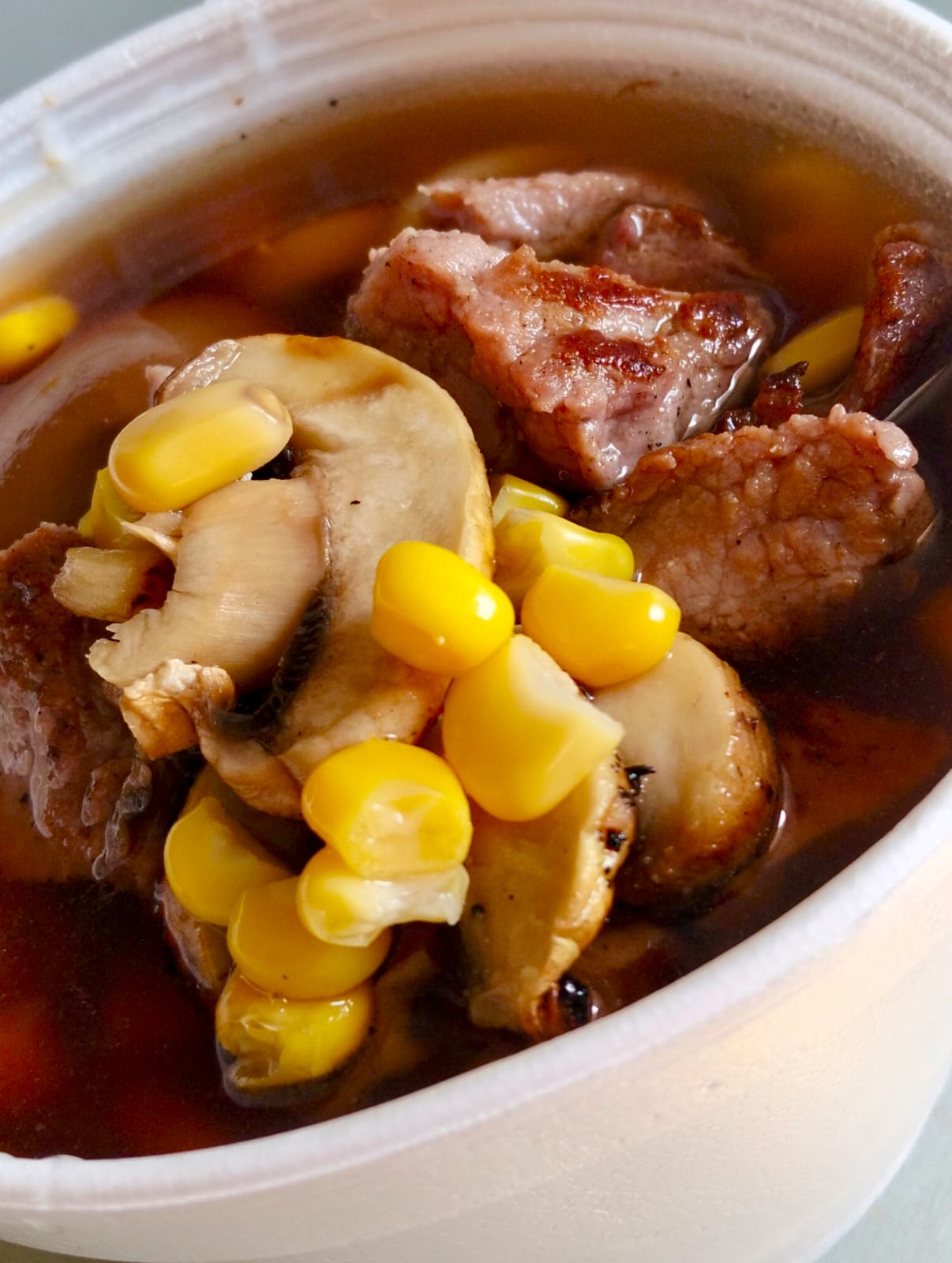 Pasta udon, res, shitake, elote, huevo y cebollín.
