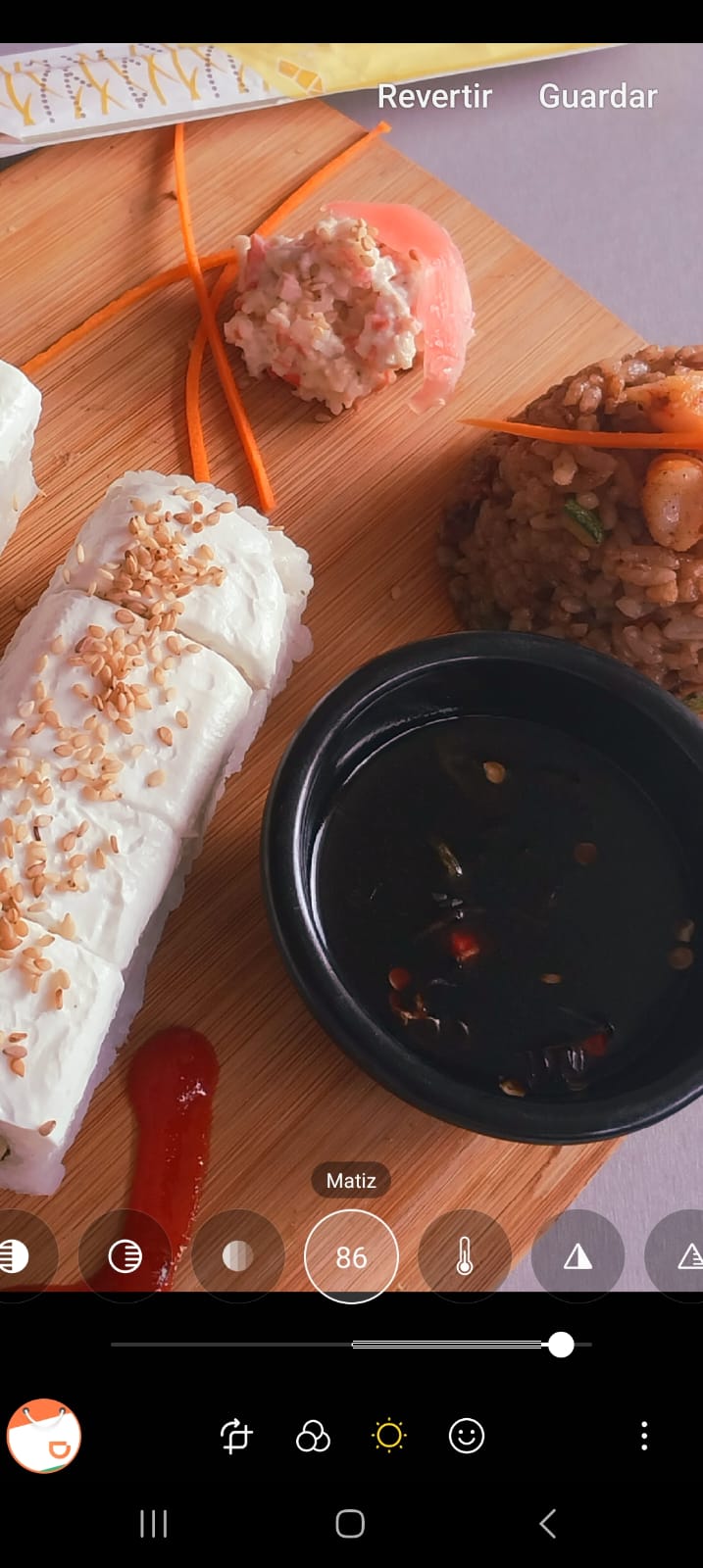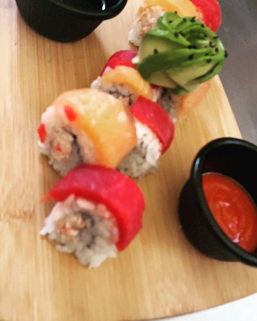 Por dentro: camarón tempura y aguacate, por fuera: atún sellado y sriracha.