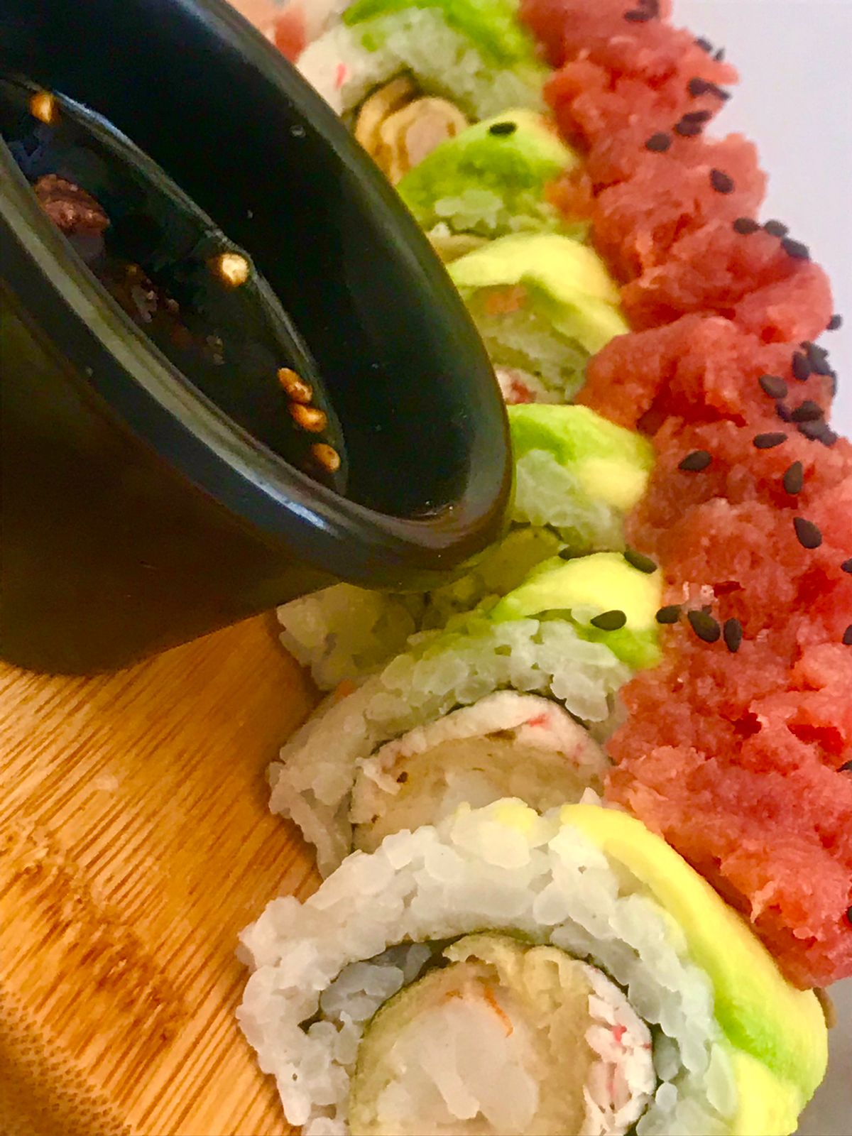 Por dentro: atún picante, pepino y aguacate, por fuera: ajonjolí negro.