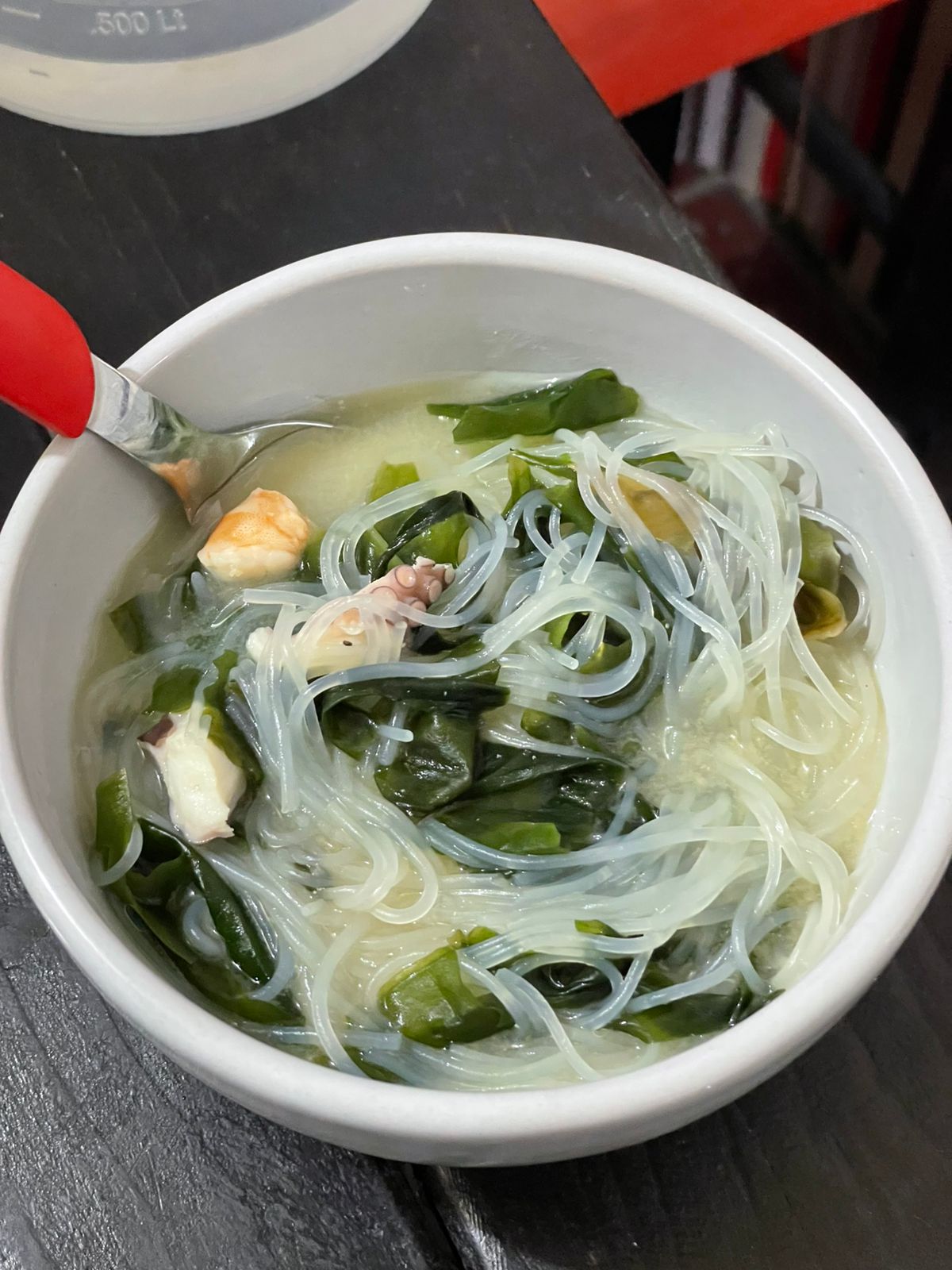 Pastra udon, camarón, shitake, elote, huevo y cilantro.
