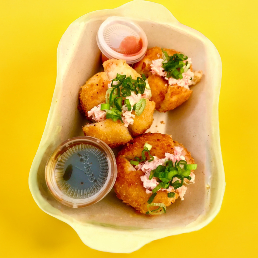 Bolitas de arros empanizadas, rellenas de tampico, bañadas con salsa de anguila, 3 piezas.