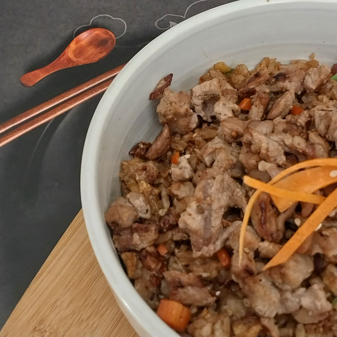 Arroz frito especia, zanahoria, calabaza y cebolla.