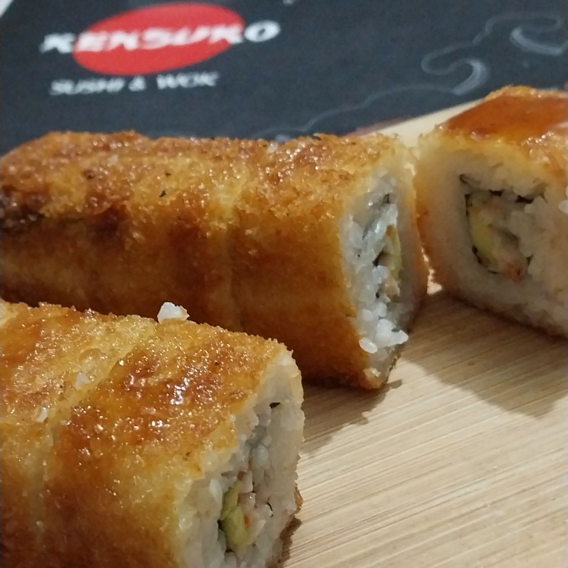 Por dentro: canicama picante y queso crema, por fuerta: empanizado y camarón tempura.