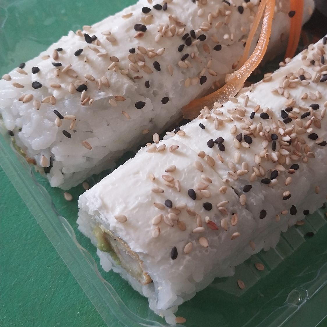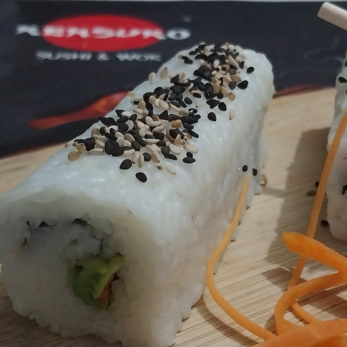 Por dentro: aguacate, pepino y zanahoria, por fuera: ajonjolí negro.
