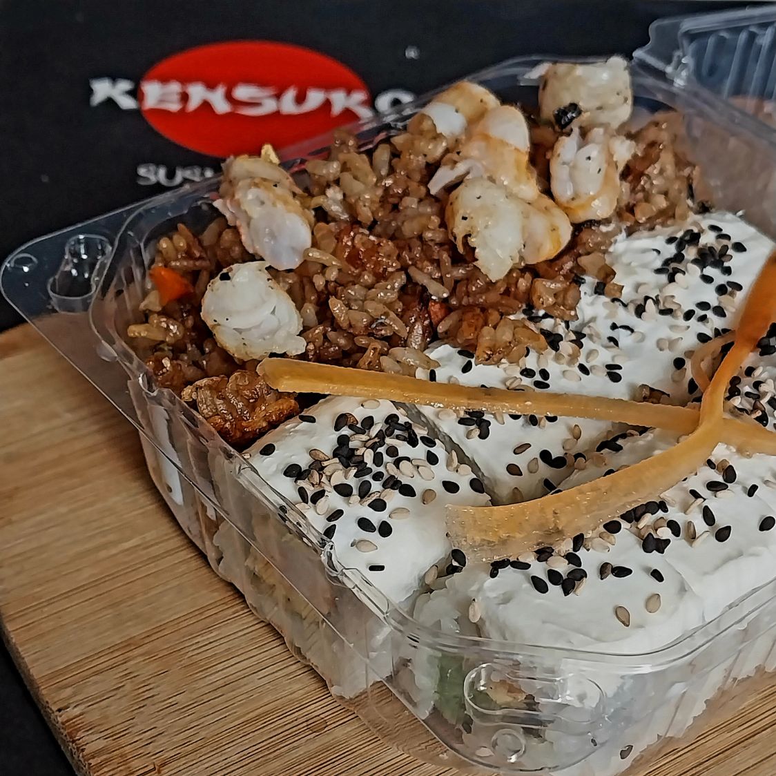 Por dentro: camarón tempura y aguacate, por fuera: Philadelphia y ajonjolí negro.