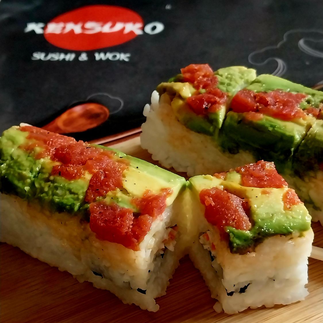 Por dentro: tampico, por fuera: salmón, atún y aguacate.