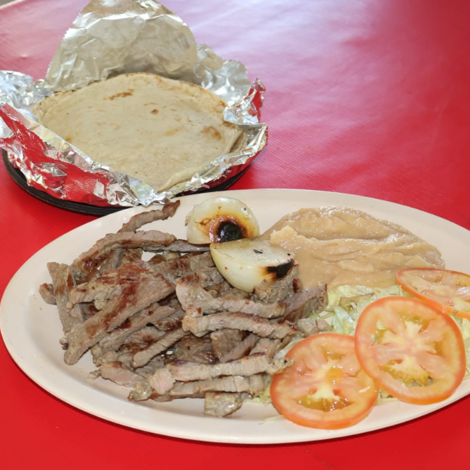 Porción de carne asada acompañada de tortillas Hechas a mano, ensalada y frijoles fritos.