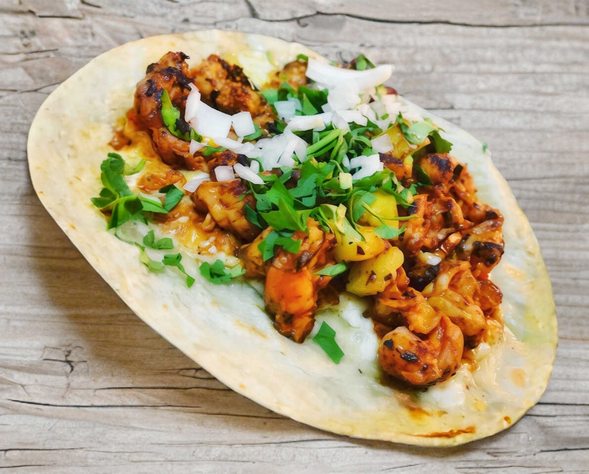 quesadilla con tortilla de harina, queso gratinado y pulpo, tocino, cebolla, piña guisado a la plancha con especies