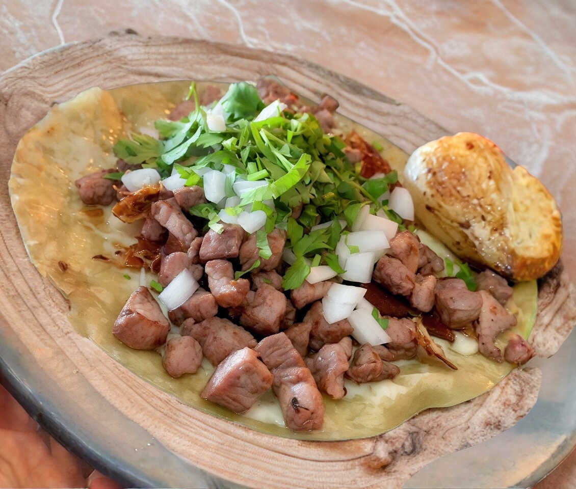 con tortilla de harina, queso gratina acompañado de cebolla y cilantro
