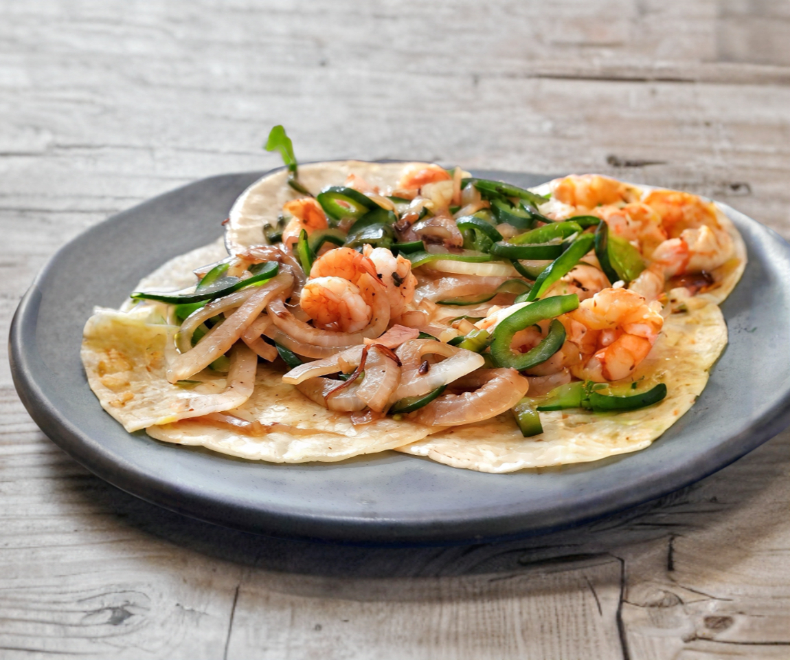 camaron guisado a la plancha con especies y servida con tortilla de harina.