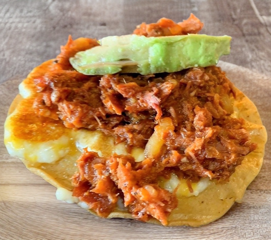 quesadilla de tortilla de harina, queso gratinado, pulpo guisado a la plancha con especies.