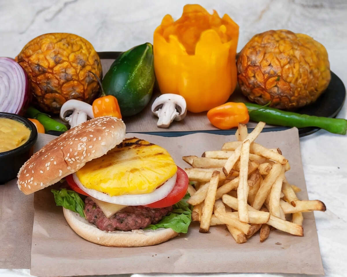 130gr de res molida preparada con la receta de la casa. acompañada de lechuga, jitomate y cebolla. Queso manchego, tocino crujiente y salsa bbq.