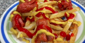 Papá natural doradita a la perfección acompañadas de salchichas cortadas de manera singular.
