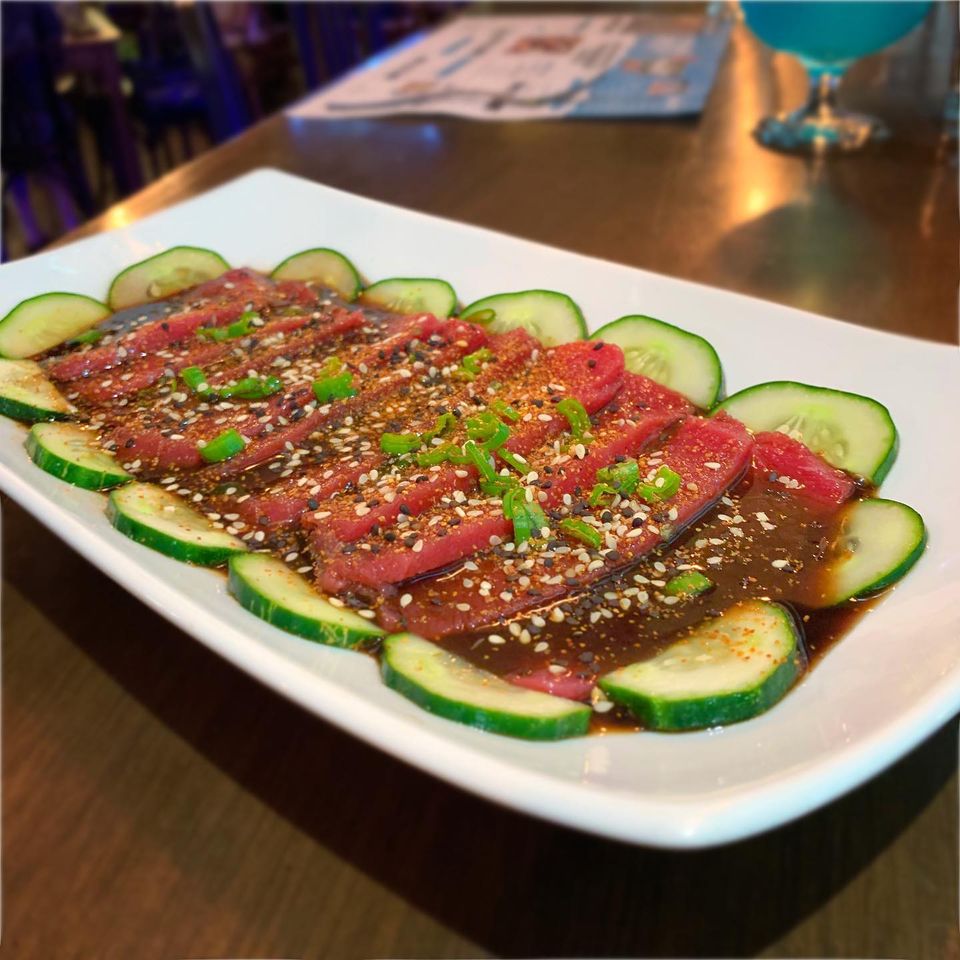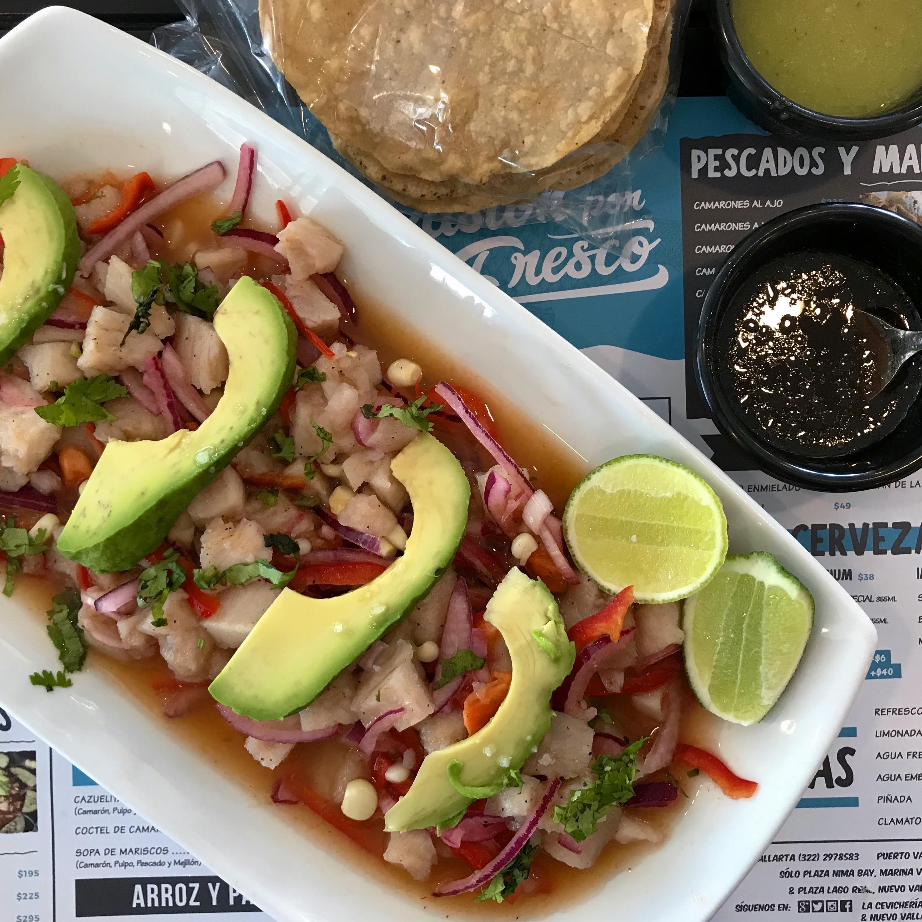 Con base de ceviche de pescado, camarón, pulpo y callo de almeja, con pepino, cebolla y salsa chile de árbol.