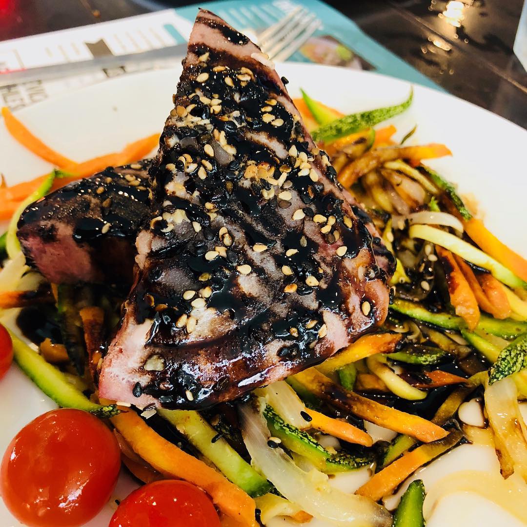 Camarón, pulpo y carne zarandeados y sazonados en salsa de ajillo.