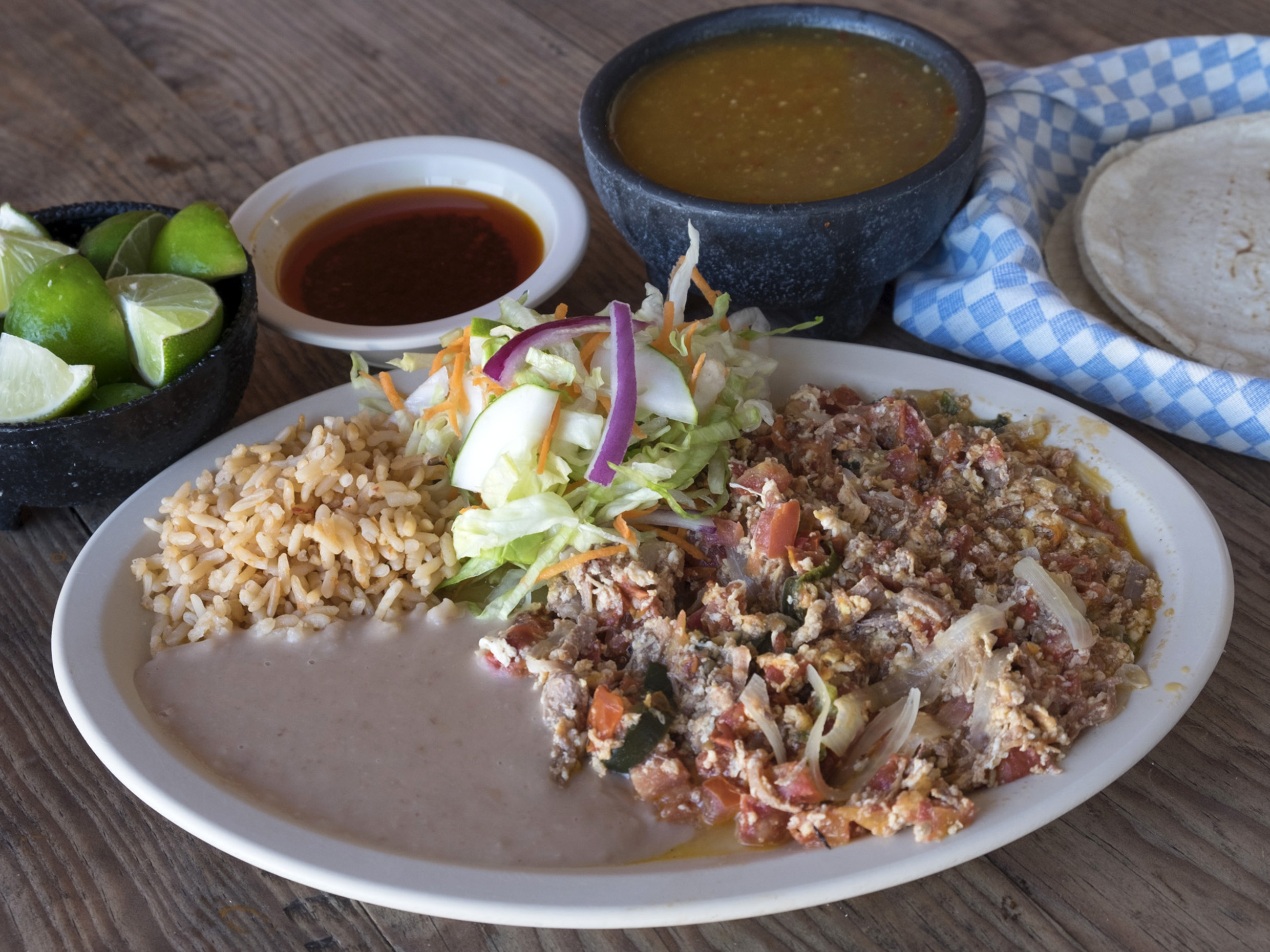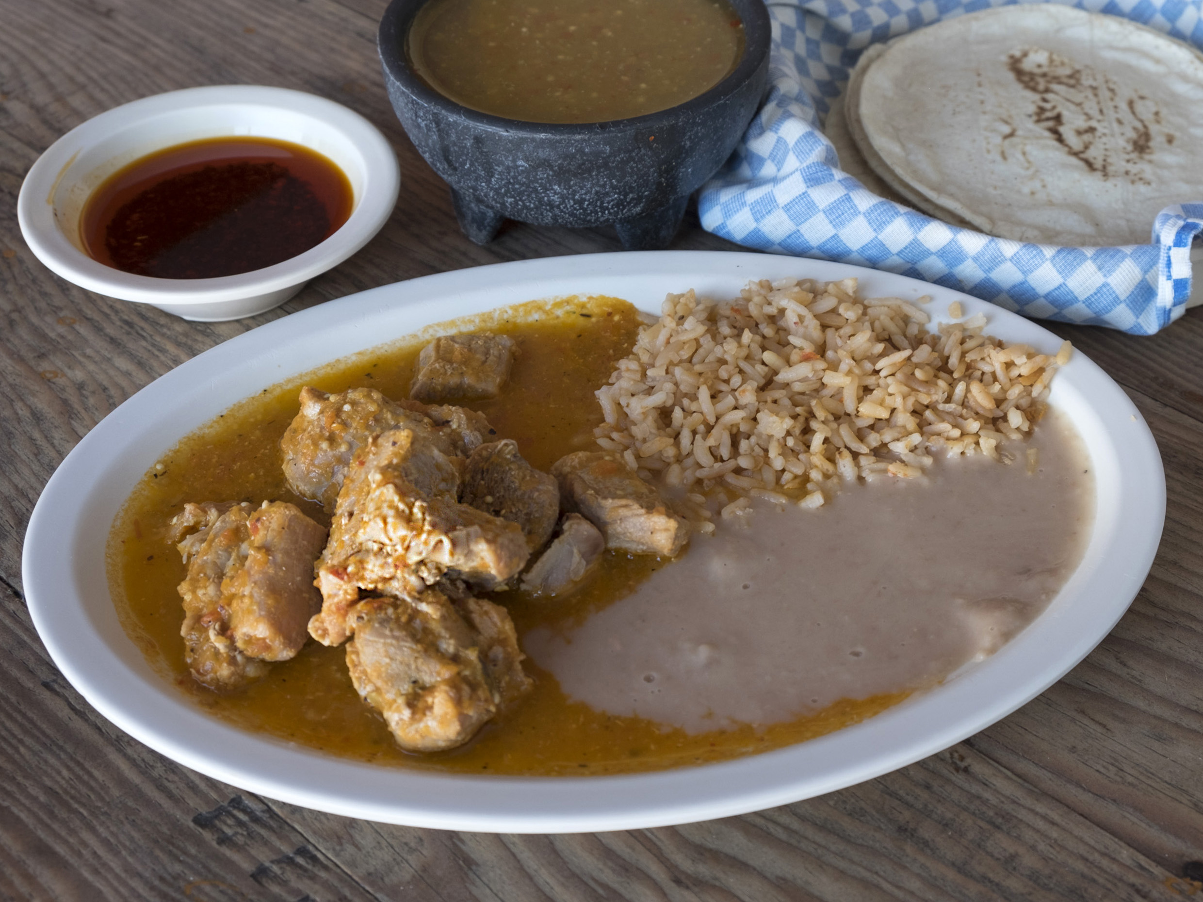 Acompañado de arroz, frijoles y sopa del día.