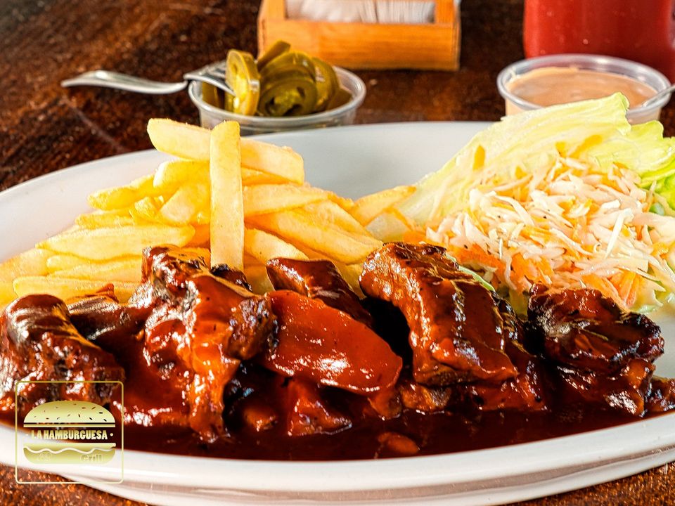 400 Gramos Costillas BBQ acompañadas con ensalada de col y zanahoria y papas fritas