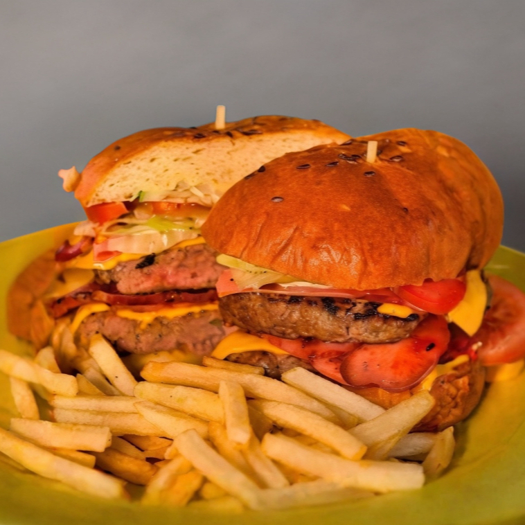 Doble proteína, doble queso amarillo, jamón, tocino doradito, lechuga, jitomate, pepino, cebolla. Incluye papas fritas.