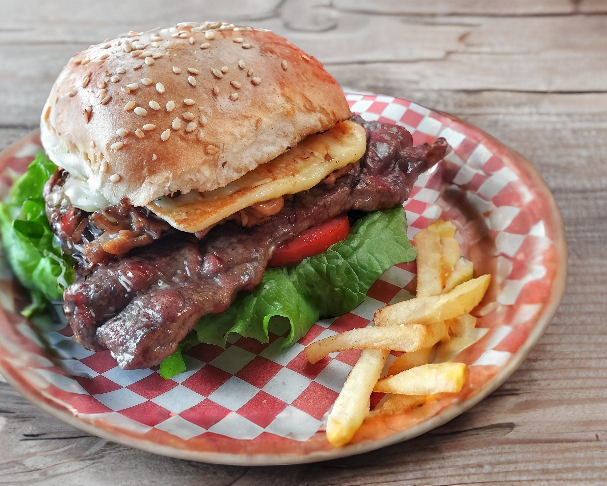 Doble carne molida de res o pollo con doble queso amarillo, jamón y tocino doradito, incluye papas fritas.