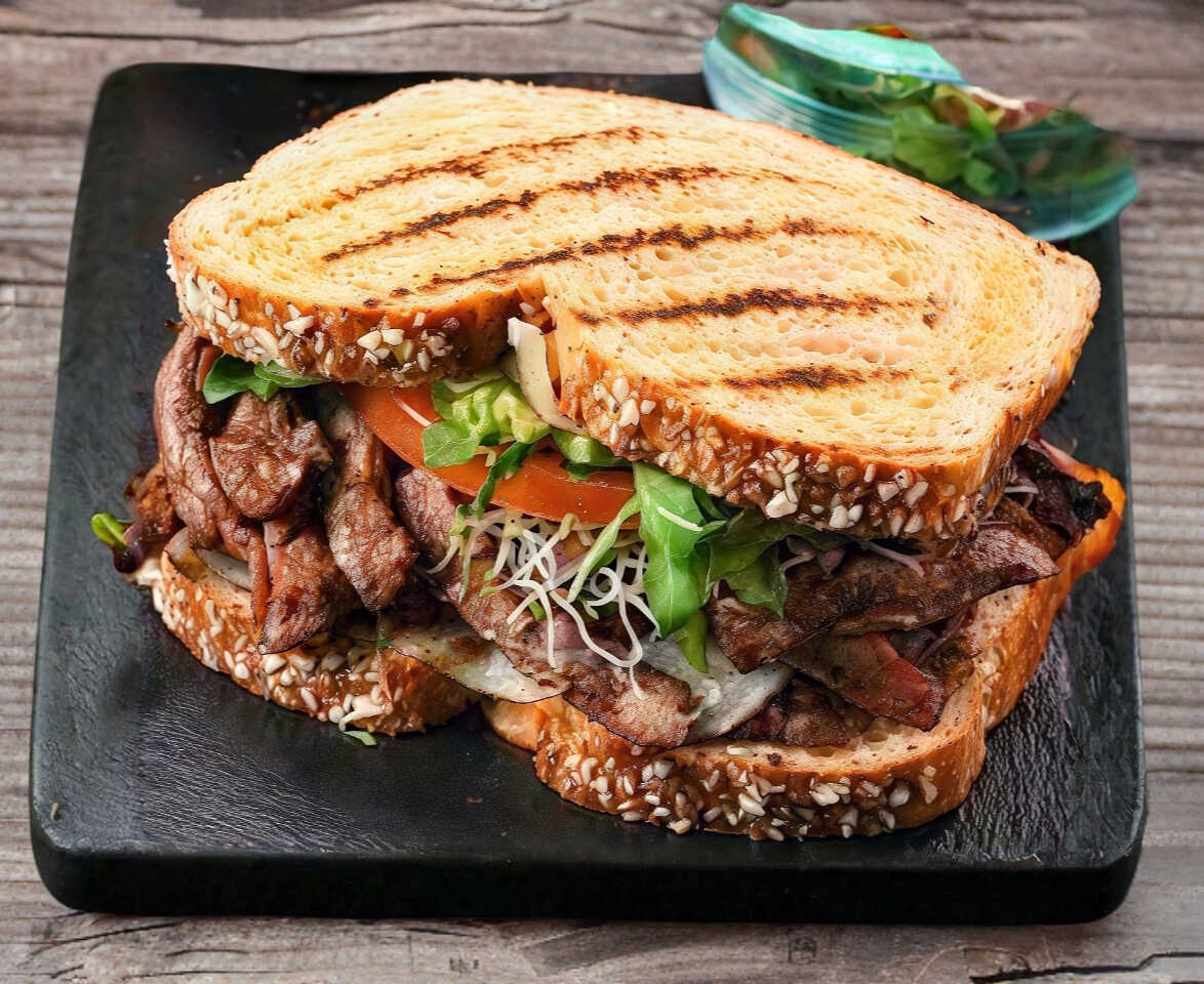 Pechuga de pollo, tocino y queso crema en un bagel de queso parmesano, acompañado con ensalada de lechugas mixtas, zanahoria, betabel y jitomate.