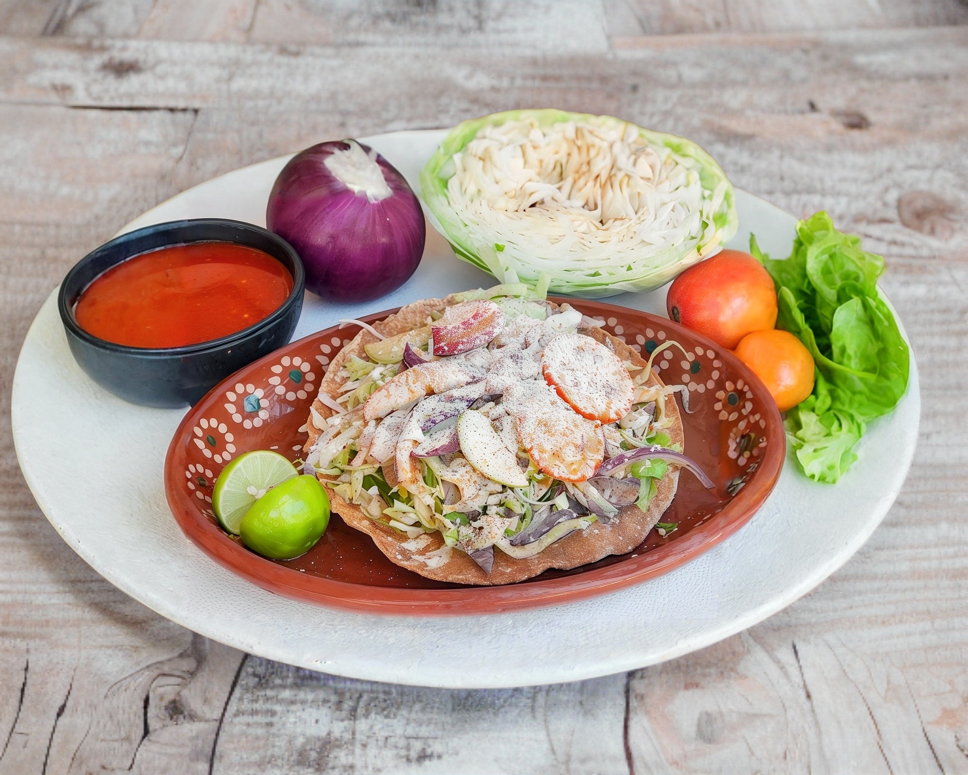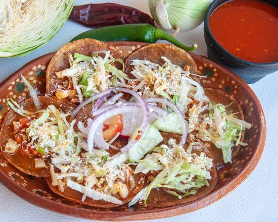Para una persona. Pozole rojo, acompañado de su carne preferida (pollo, pierna o lengua) 3 doraditas recién hechas. salsa, limon, cebolla, pepino. Lechuga o repollo.