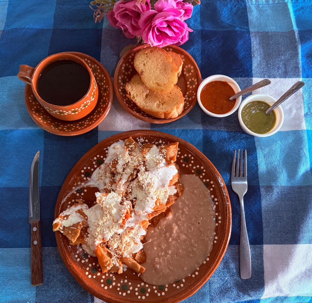 TOTOPOS,SALSA ROJA, TORTA DE HUEVO CON QUESO GRATINADO, FRIJOLES,CREMA,QUESO Y CAFÉ DE OLLA