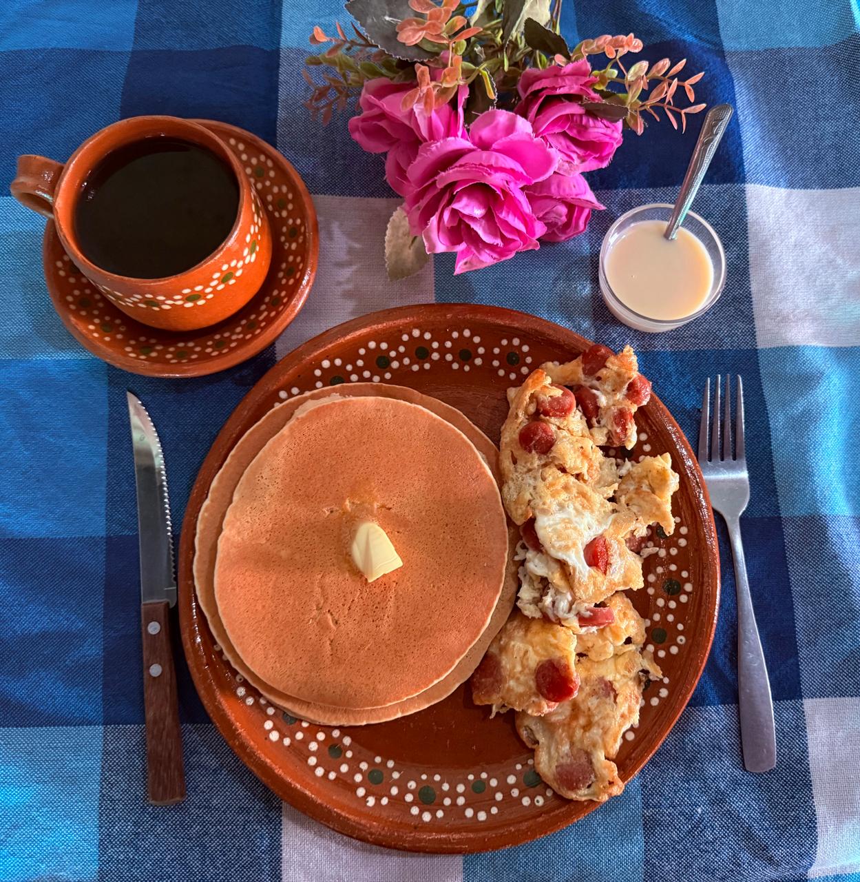 2 PIEZAS DE HOT CAKES, HUEVO REVUELTO O ESTRELLADOS, MAPLE Y CAFÉ DE OLLA