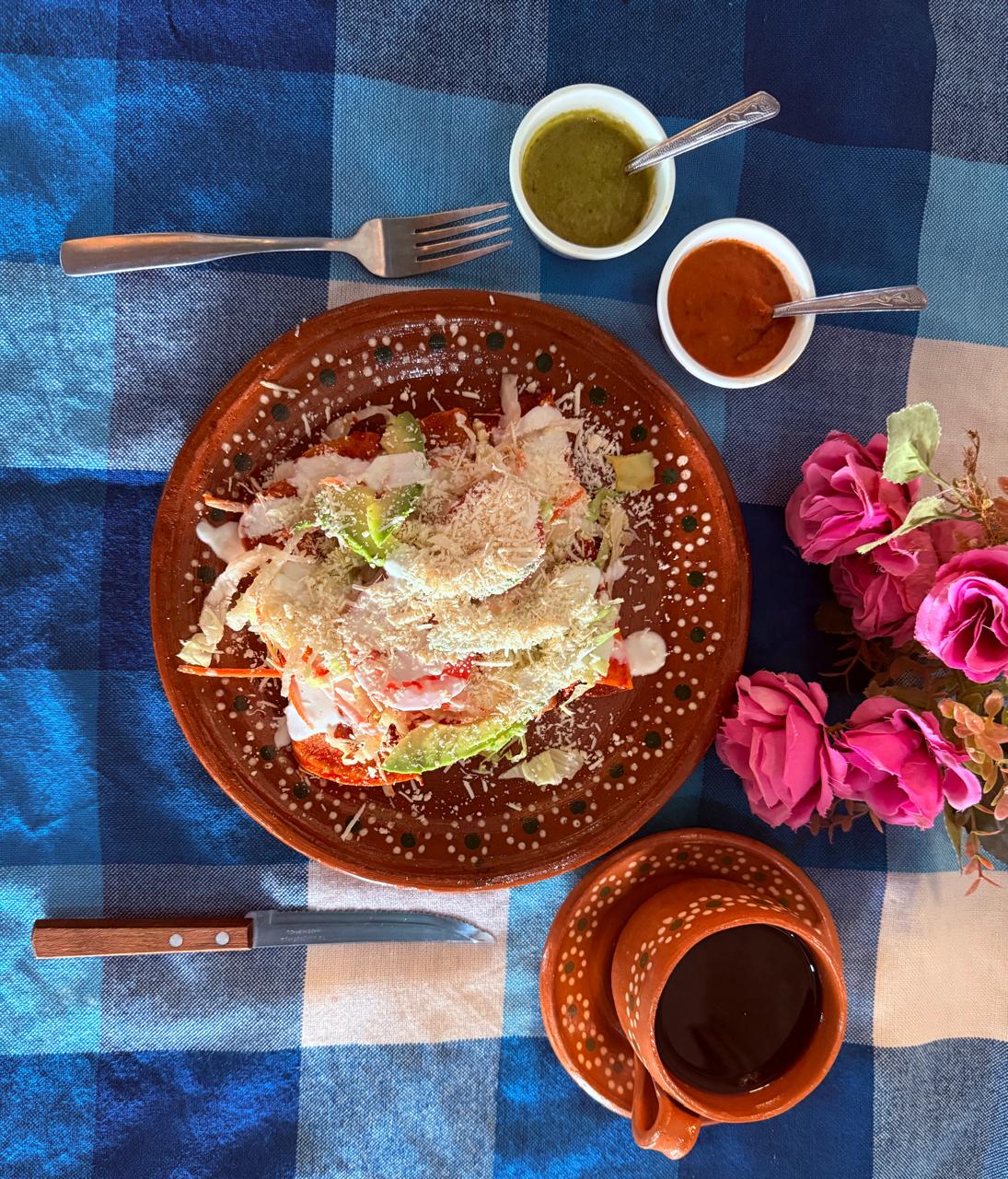 TOTOPOS,SALSA ROJA,QUESO GRATINADO, CREMA Y CAFÉ DE OLLA
