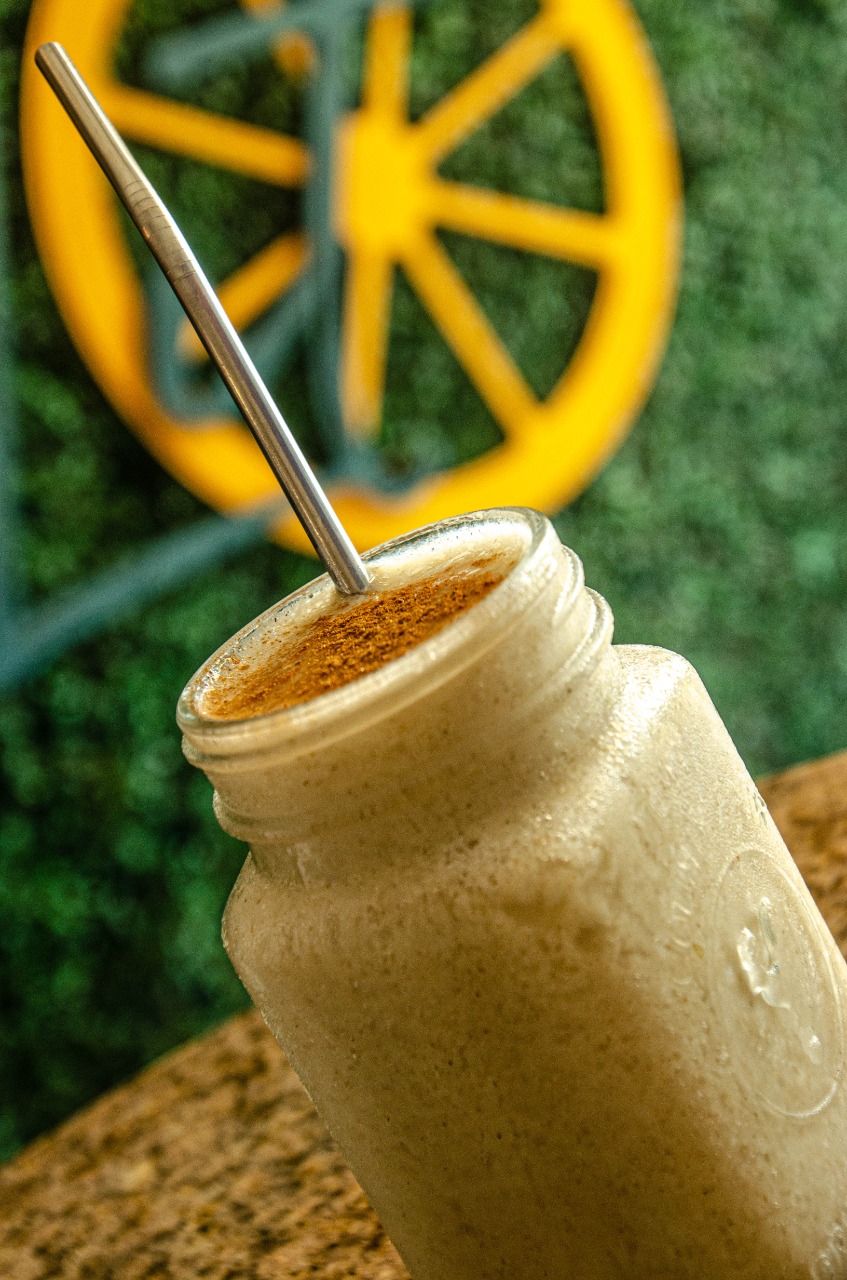 Plátano, café, avena, crema de cacahuate, chocolate, leche.