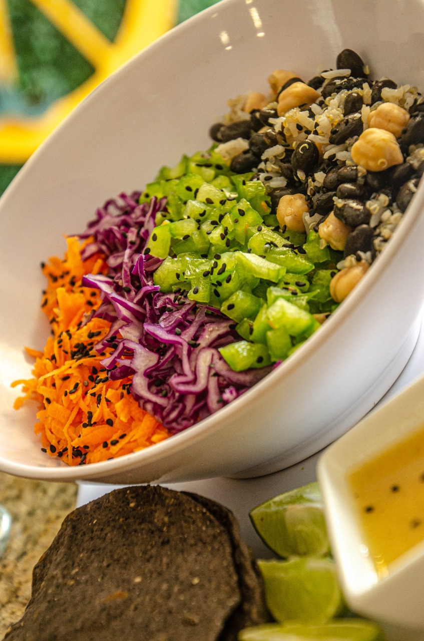 Ensalada servida con tostadas horneadas de maíz azul, arroz, frijol, quinoa, garbanzo, morrón, col morada, zanahoria.