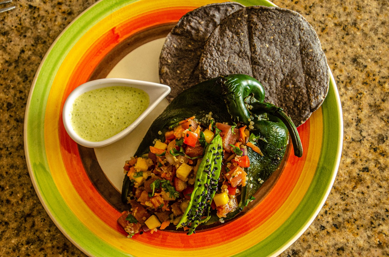Cubos de atún fresco ensalada servida con tostadas horneadas de maíz azul. Poblano asado, relleno con ceviche de atún premium con mango y quinoa.