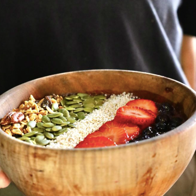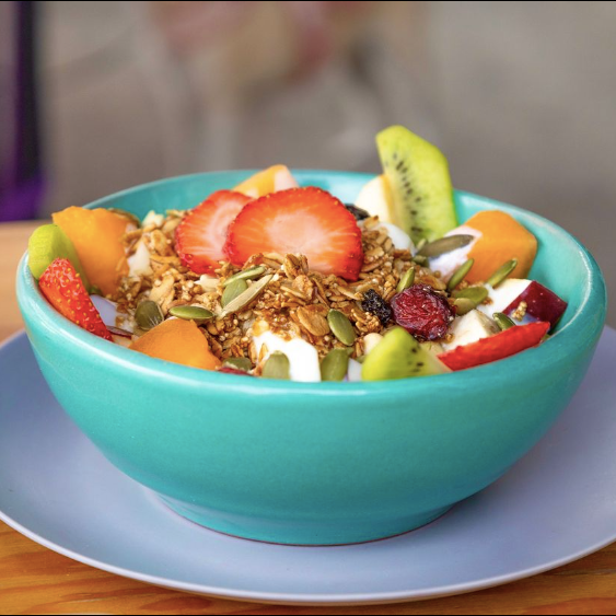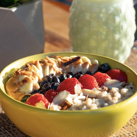 Guayaba, plátano, jugo de naranja, yogur griego, vainilla, almendras, amaranto.