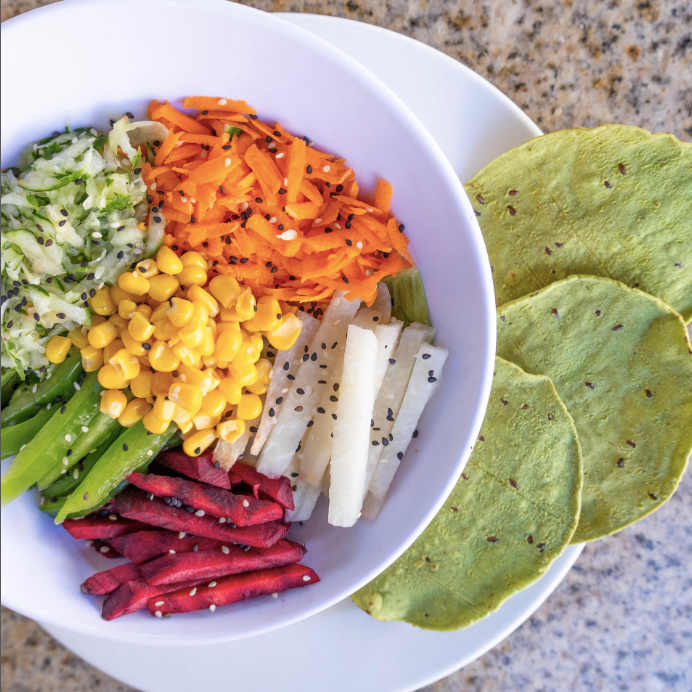 Green mix de lechugas, zanahoria, betabel, elote, morrón, jícama y pepino, tostadas de maíz azul.