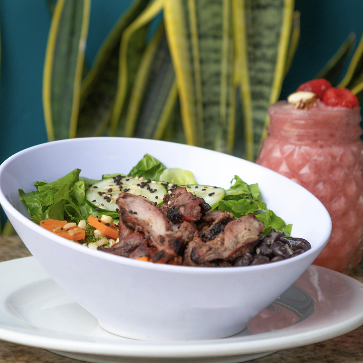 Atun sellado con ajonjoli, hummus, arroz, lechuga, zanahoria, col morada y aderezo de cacahuate thai.