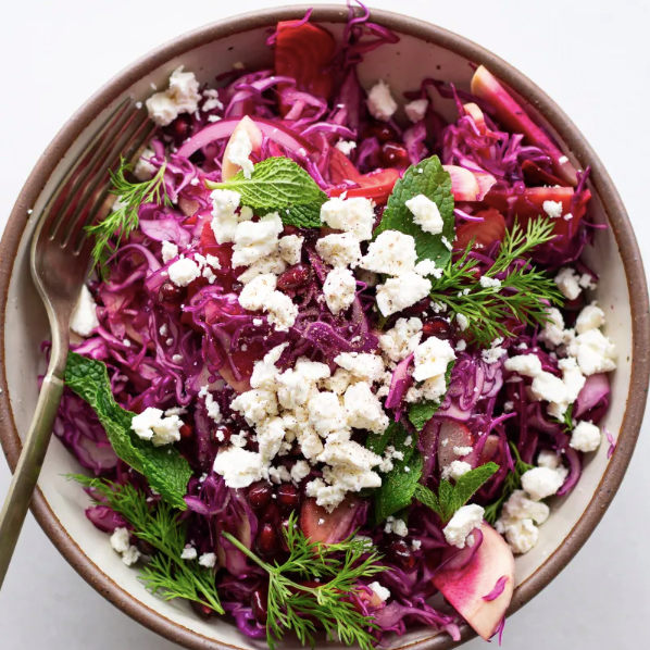 Ensalada betabel, col morada, manzana verde, queso de cabre, nuez, arándano y vinagreta