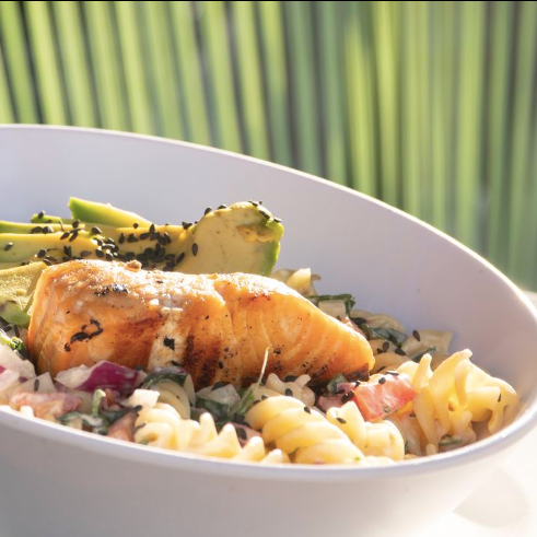 Medallón de atún sellado con ajonjolí, ensalada servida con tostadas horneadas de maíz azul, fusilli, jitomate, espinaca, apio, cebolla y crema.