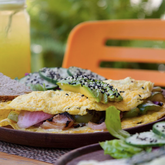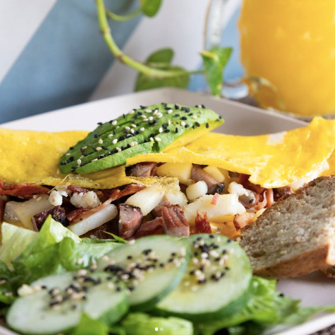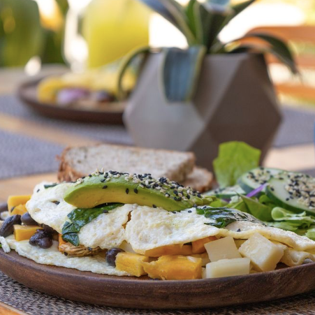 Omelet de claras, con papa, camote, frijol, queso, espinaca